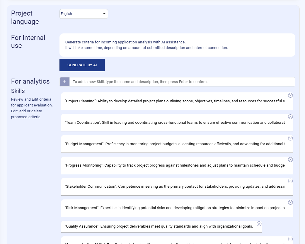 Internal Description – this is the most important content field for defining the project in detail. This description can include more information than publication and this is used for AI analytics as context for evaluation criteria generation, onboarding and learning plan creation.