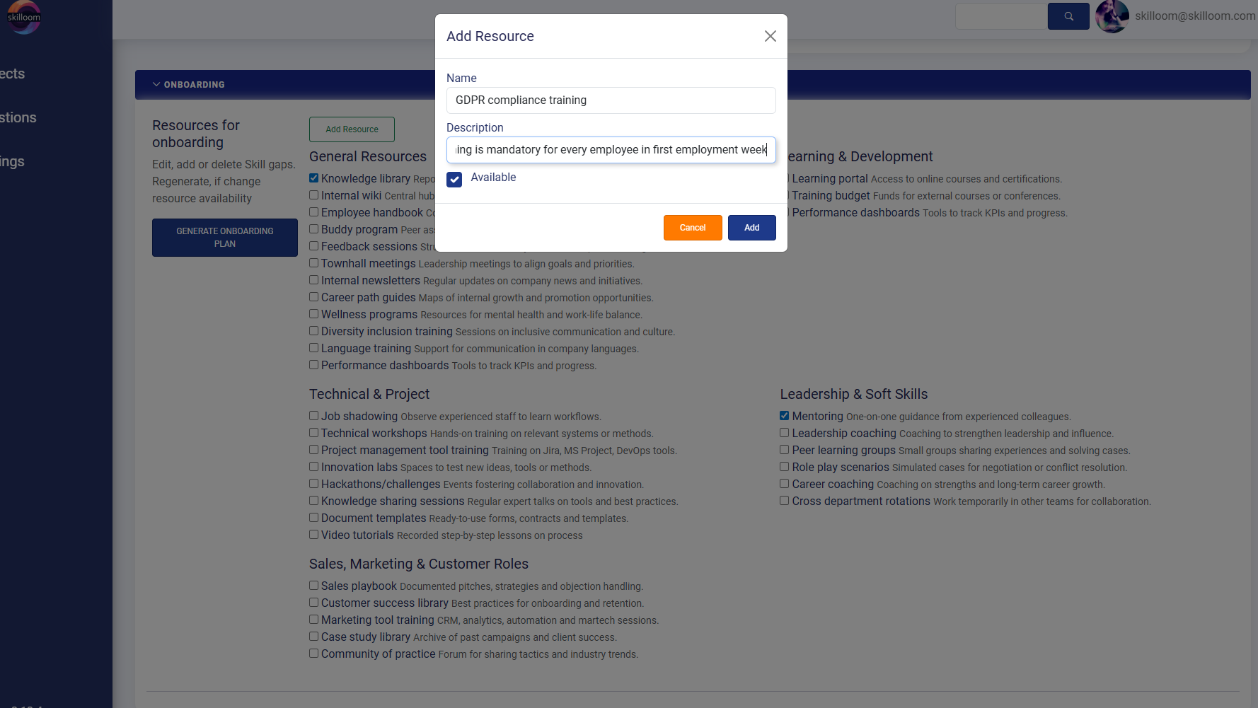 In Skilloom the Onboarding Plan is created based on the resources your company can actually provide to a new employee (internal materials, people support, sessions, tools, etc.).