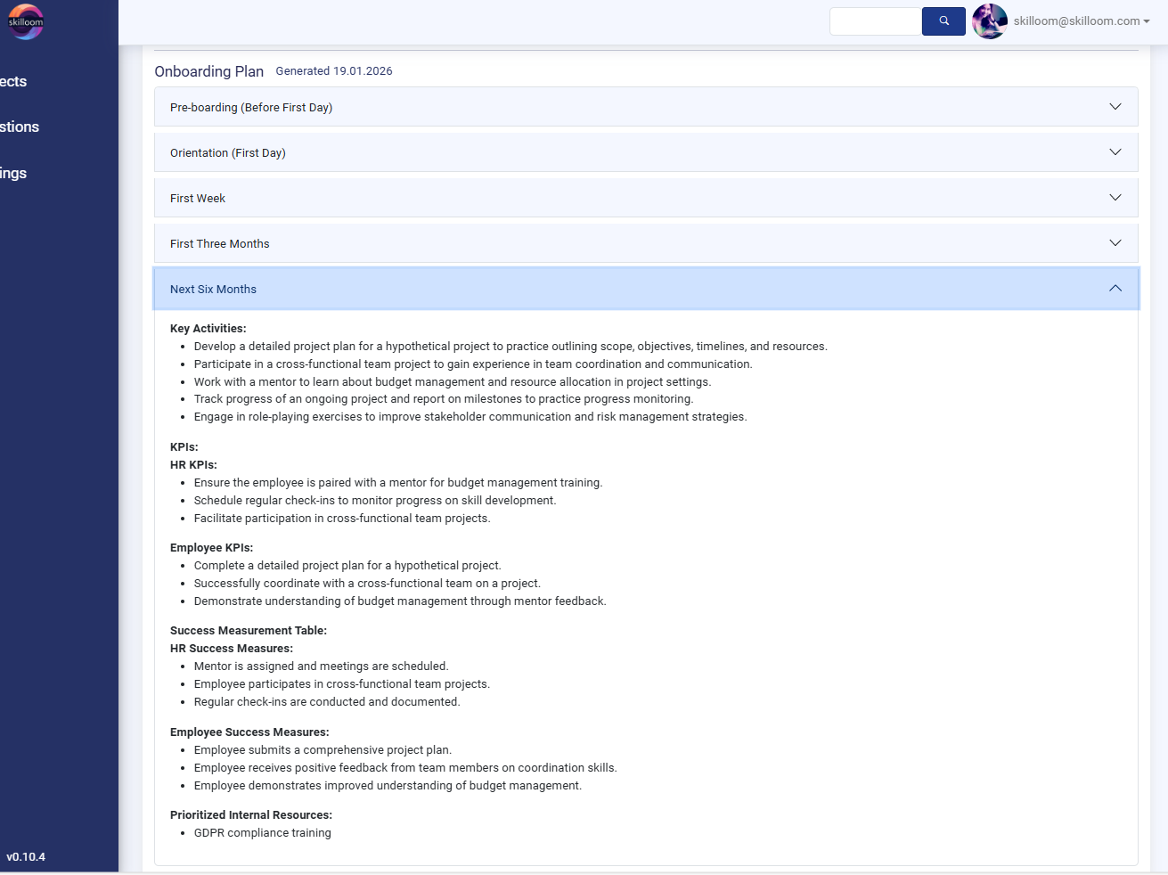 In Skilloom, the Learning Plan is generated as a ready-to-use set of learning recommendations for a selected employee, role and based on training the employee according to identified and individual skill-gaps.