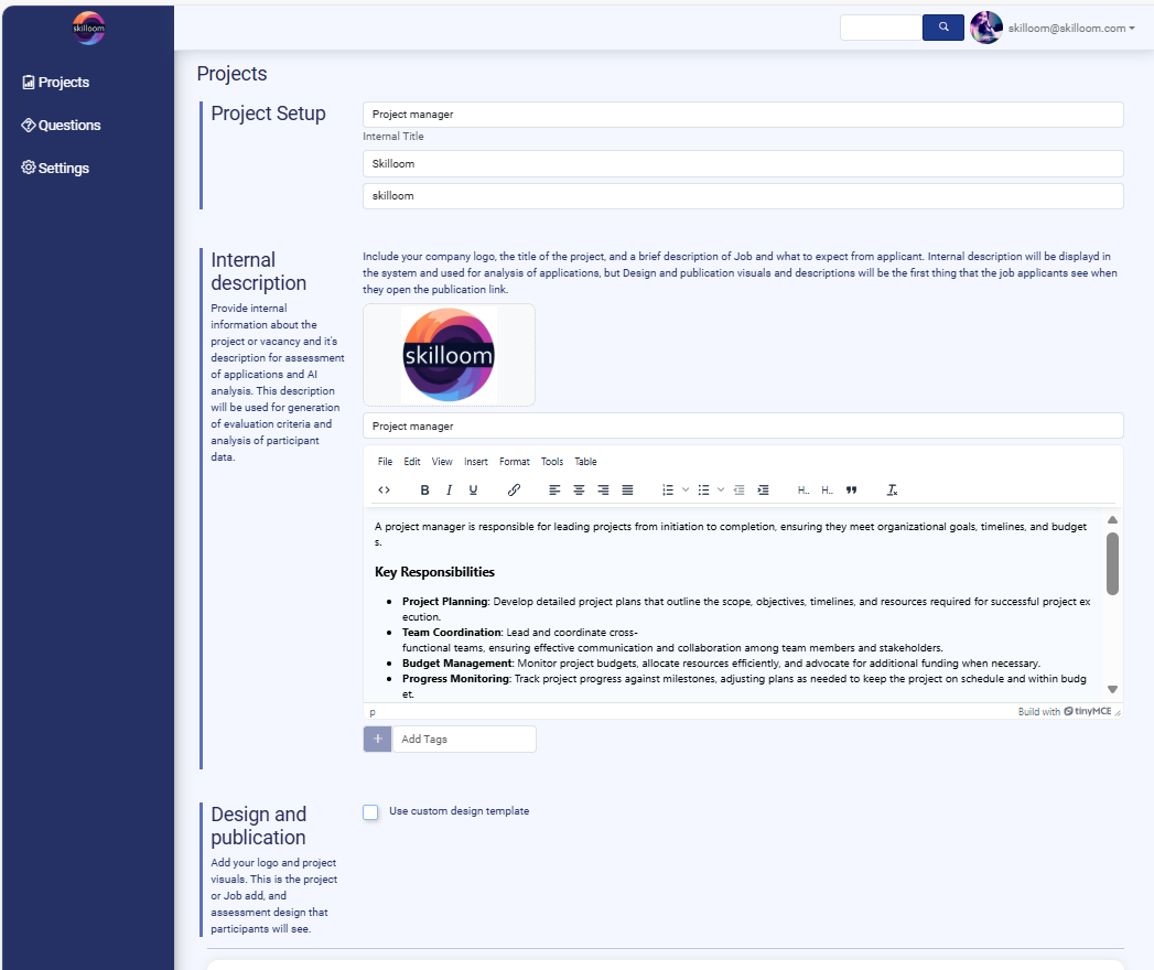 Project Setup is the main Information section where you define the key details of a recruitment or assessment project before publishing it to candidates. This information is used internally by your team and also supports Skilloom’s automated evaluation logic.