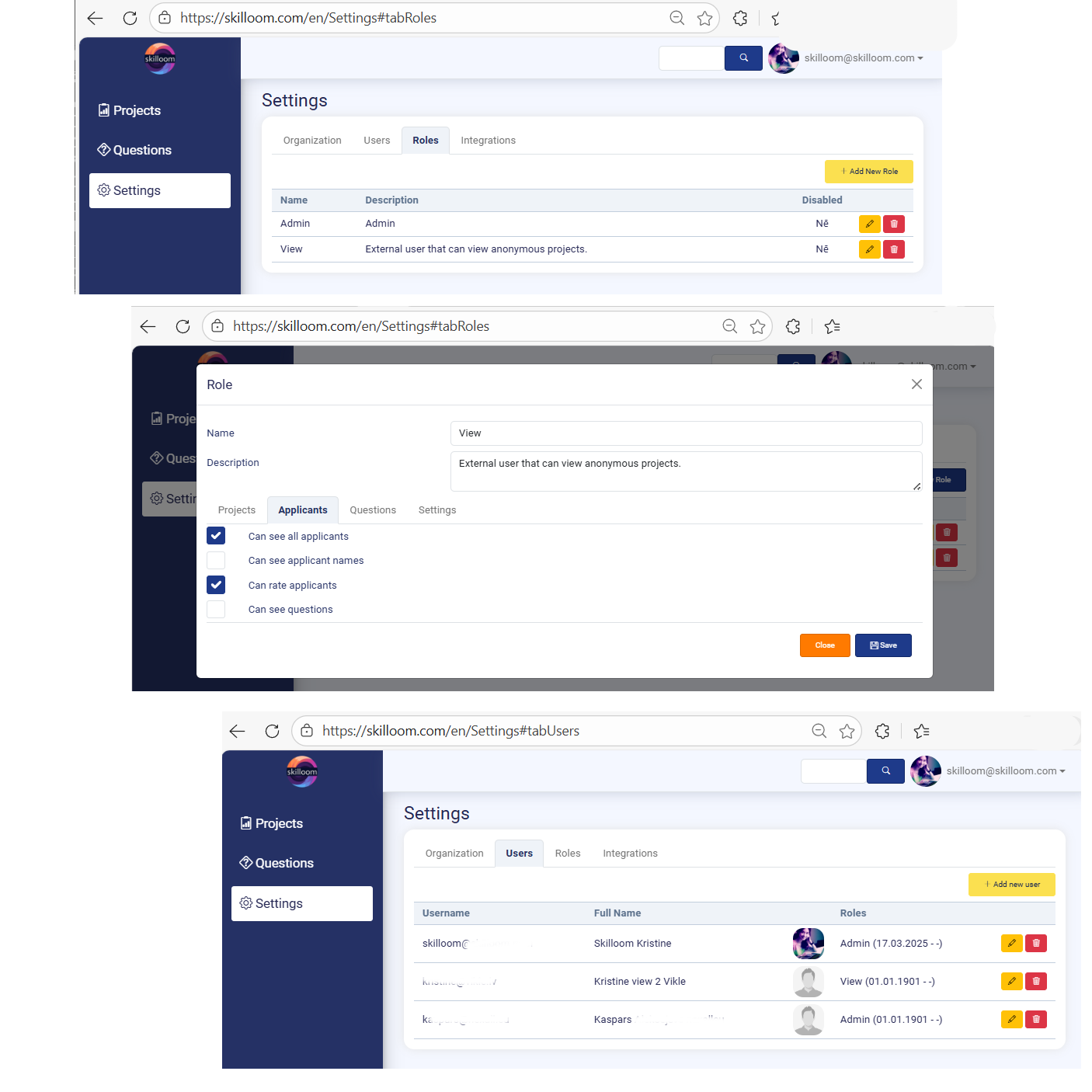 To add new users to your organization go to Settings → Roles and create necessary roles with necessary limitations for Users. The default rights are the most limited rights that allow users to view project without GDPR protected applicant information. By creating new roles you can add rights from lists.