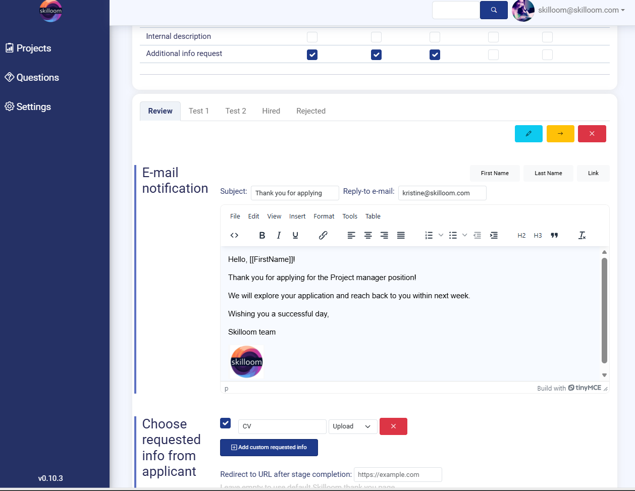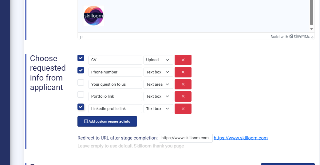 Additional info request – request extra information from candidates during that stage. As default, Skilloom requests Name, Surname and e-mail address that is an identificator of the candidate.