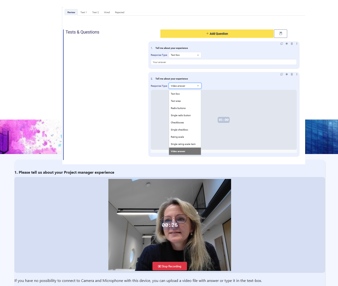 Candidates can record a video response directly inside the assessment page. A visible recording timer shows the allowed duration 01:00 min max. Candidate will see also guidance text explaining alternatives if video recording is not possible – upload a video file or type the answer in a text box instead.