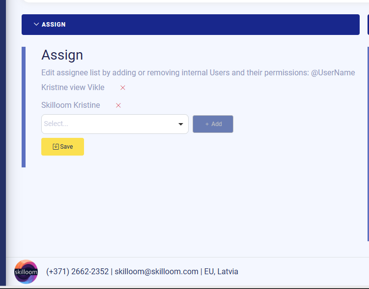 Inside a project, Skilloom has an Assign section where you control who can access this project. When user is assigned to the project, it sees the project in project list and can manage upon assigned right limitations.