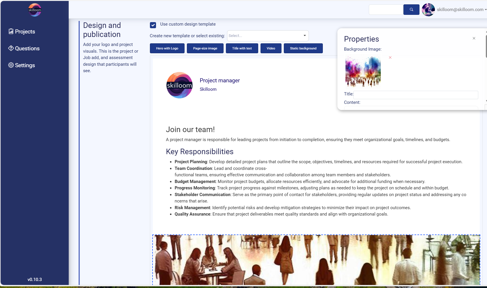 In the centre you see a real-time preview of how the project will look for candidates. After saving the project you will be able to open link in your device browser to test the design look and adjust and edit it after saving or even after publication, if any mistakes show up.