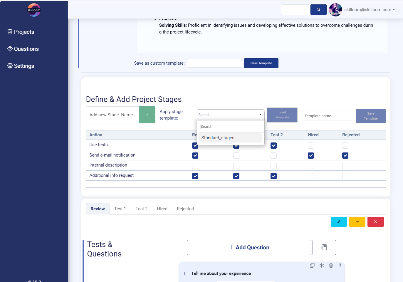 Skilloom lets you to save your hiring project stage templates and next time apply a ready-made stage structure instead of building it from scratch. To do that choose a template from “Apply stage template” dropdown and click “Load Template” to apply it.