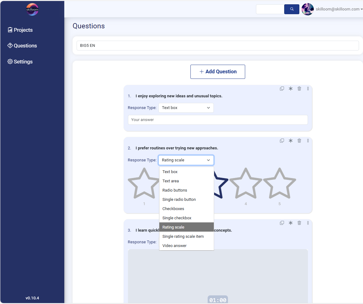 Choose response type how the candidate should answer. Response types supported in Skilloom are text box (short answer), text area (long answer), choice-based answers, radio buttons (select one option), single radio button (simple yes/no or confirmation), checkboxes (select multiple options, single checkbox (acknowledgement / agreement), rating scale, single rating scale item, video answer (it also will be evaluated as transcript).